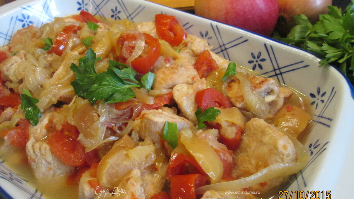 Все вроде бы просто, но так вкусно: сочетание яблок с помидорами, в окружении такого же огромного количества лука! С такими овощами и фруктами даже нежирное филе индейки получается очень сочным.
