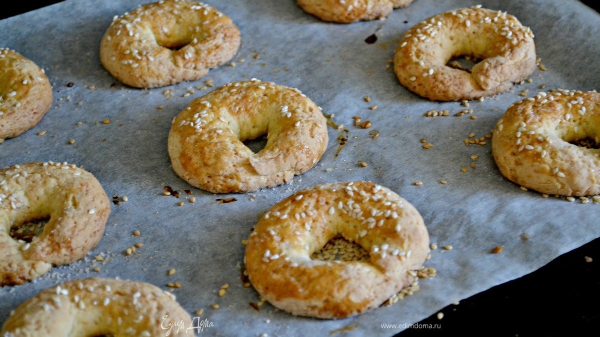 Возьмите немного теста, размером с грецкий орех, скатайте колбаски толщиной 1 см и защипните концы, делая кольца. - Шаг 5Выкладываем на противень, застеленный пергаментом. Кольца смазать яйцом и присыпать сахаром и кунжутом (маком, орехами и т.д.).