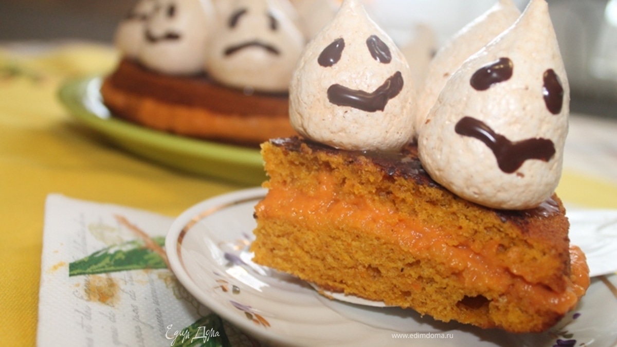 В форму выкладываем один корж и прослаиваем его тыквенным пюре. Сверху кладем второй корж. Берем безешку и с помощью вареной сгущенки приклеиваем ее к коржу. Так поступаем со всеми безе. Готовый пирог можно подавать сразу. - Шаг 9