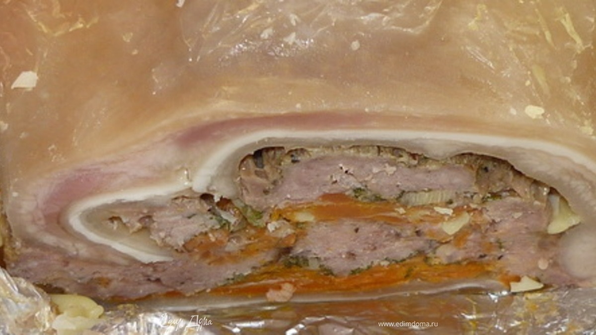 - Шаг 11. Свиные уши отварить в подсоленной воде в течении 1 часа. Затем их достать из бульона и остудить. 2. В фарш добавить соль, перец, яйца. Всё перемешать. 3.На фольгу положить свиное ухо - посолить, поперчить, посыпать сухим желатином. Затем положить слой натертой моркови, посолить, поперчить, посыпать желатином. Посыпать порубленной зеленью укропа. Сверху положить чеснок, нарезанный пластинками. Затем положить слой фарша,посолить, поперчить.Всё повторить - слой моркови, слой зелени, чеснок, фарш и т.д. Сверху положить второе ухо. 4. Всё закрутить плотно фольгой, поместить в плотный целлофановый пакет. Варить в большом количестве воды 1,5 часа. 5. Переложить в миску под пресс и поставить в холодное место на 6 часов.