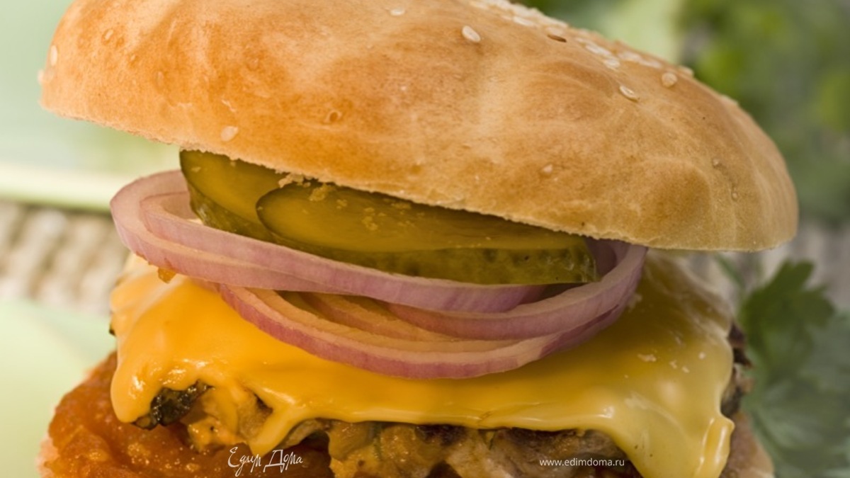 Соленый огурец нарезать кольцами, вторую половинку лука нарезать кольцами. Затем смазать нижнюю половинку булочки кетчупом, выложить ломтик сыра, потом котлетку (если добавляли сыр, то расплавленным сыром вверх), кольца лука, соленый огурец, добавить еще один ломтик сыра и накрыть верхней половинкой булочки. - Шаг 6