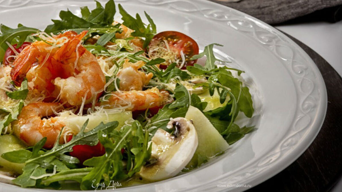 Выложить на тарелки руколу, помидоры, грибы, дыню и перемешать. Сверху поместить горячие креветки, посыпать пармезаном и полить заправкой. Приятного аппетита!