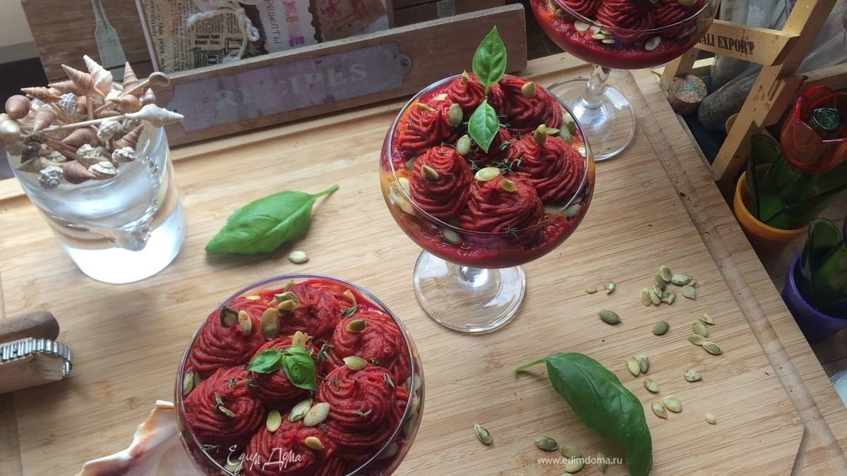Стремительно сибираем красоту: Слой крем-борща, грибы, слой тыквенного хумуса, тыквенные семечки, борщ, базилик, декорации, хлебцы, ложка. - Шаг 6