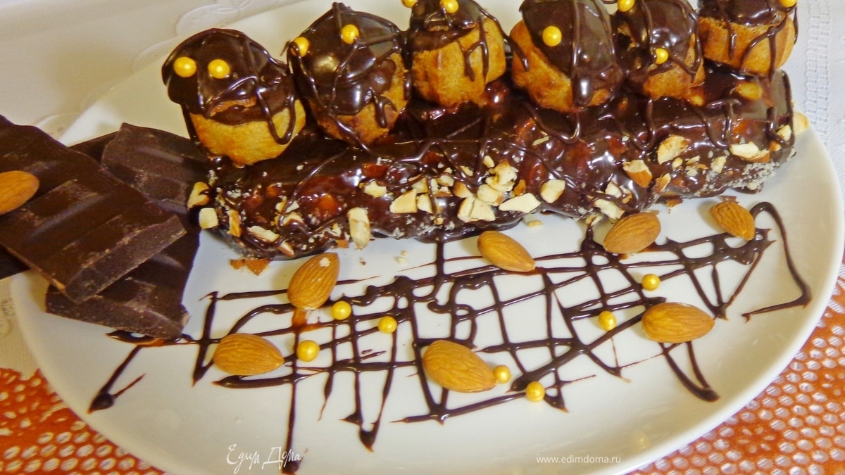 Срезанные "шапочки" маленьких эклерчиков тоже окунуть в ганаш и накрыть ими темный крем. Опять охладить. Аккуратно переложить пирожное на тарелку, украсить его золотой присыпкой и остатками ганаша. Охладить! - Шаг 10