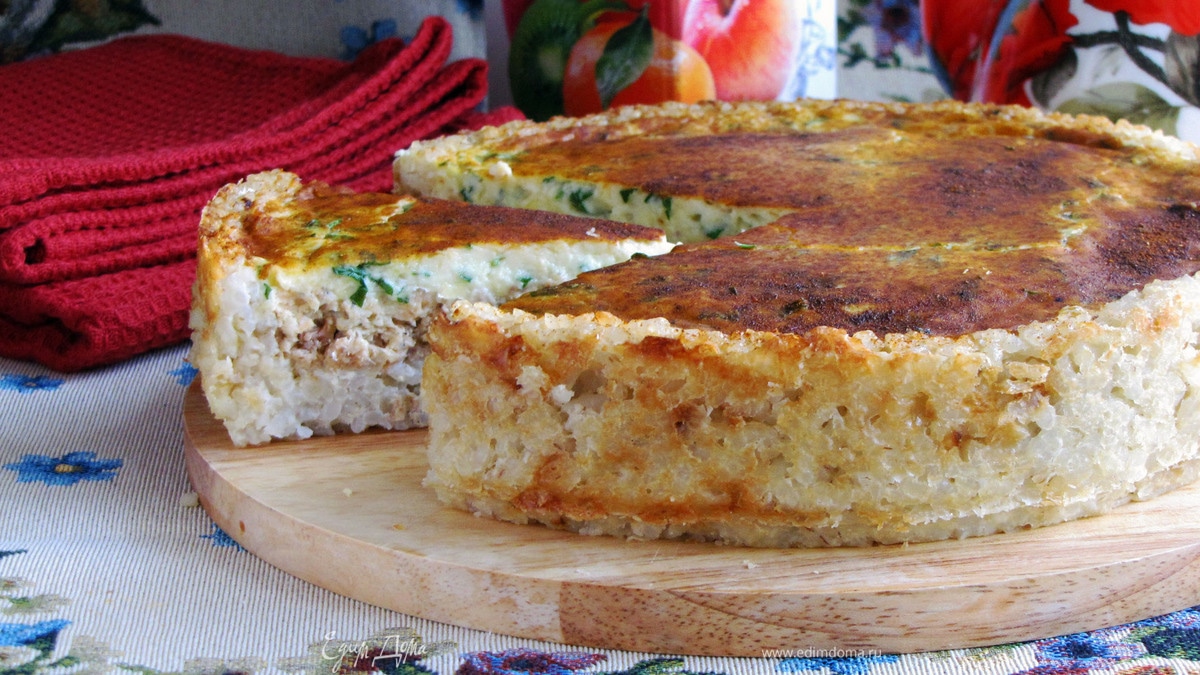 Очень нежный рыбный пирог, состоящий из трех слоев. Основа — рисовый слой, затем рыбная начинка и сверху яично-сырный соус.