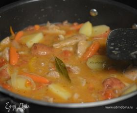 Готовить 5 минут, помешивая. Добавить лавровый лист. Убавить огонь и тушить 40 минут под крышкой.