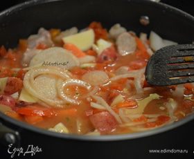 Добавить бульон, орегано и предварительно порезанные овощи, томаты баночные.