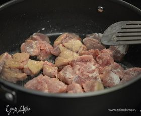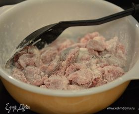 Свинину (мякоть) порезать кубиками. Обвалять в муке с солью.