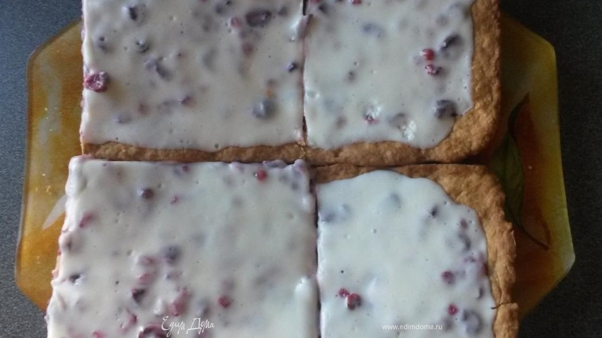 - Шаг 2Выложить сверху бруснику (можно чуть-чуть сахаром присыпать сверху) и поставить в предварительно нагретую до 180°С духовку на 25 минут. Ягоду можно брать любую абсолютно! Я пекла в этот раз из вишни и красной смородины, — вкуснота! Только замороженную ягоду, надо предварительно полностью оттаять в холодильнике (чтобы было меньше потери сока). Ягоды (любой) всего понадобится 600-650 грамм.