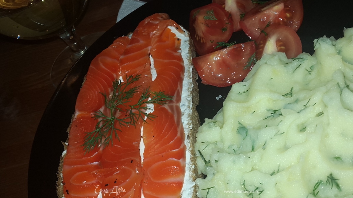 Для бутербродов: Подсушить черный хлеб в духовке, намазать сыром маскарпоне (у меня лабне), выложить сверху ломтики лосося, украсить зеленью. Я подавала на ужин с картофельным пюре. Также очень вкусны такие бутерброды со сладким чаем. Приятного аппетита!