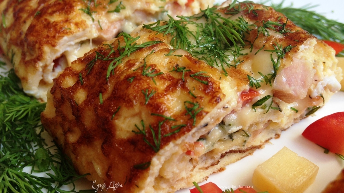 Как только омлет немного схватится, начинаем его сворачивать в рулетик. - Шаг 4