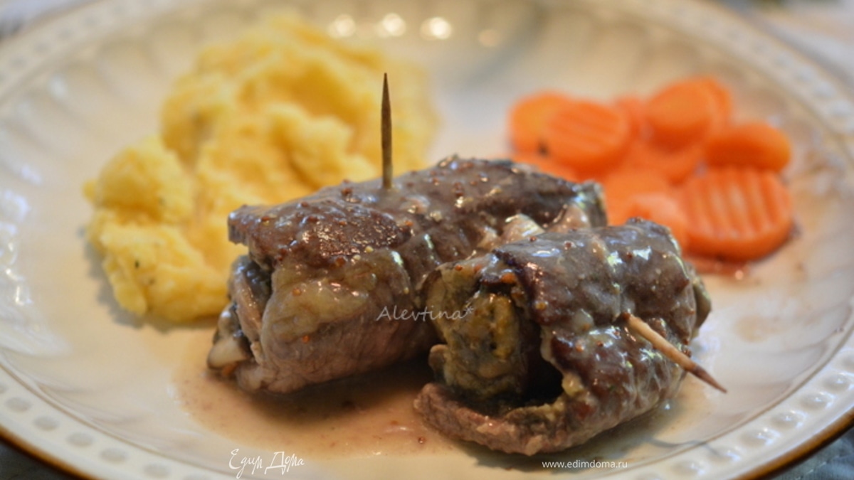 Обжарить на сковороде на растительном масле 1 ст. л. рулетики. Переложить на жаропрочное блюдо. Полить вином, добавить бульон. Прикрыть фольгой сверху. Поставить в разогретую духовку на 180°С на 1 час. - Шаг 7