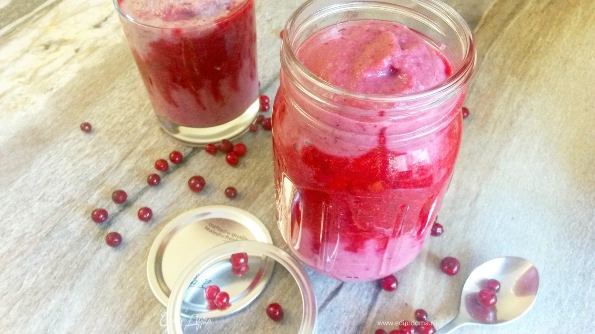 Взбиваем в блендере ягоды с медом до однородности. Можно использовать как замороженные, так и свежие ягоды. Сегодня я взяла бруснику. Очень вкусно получается со смородиной. Сладость регулируем по вкусу.