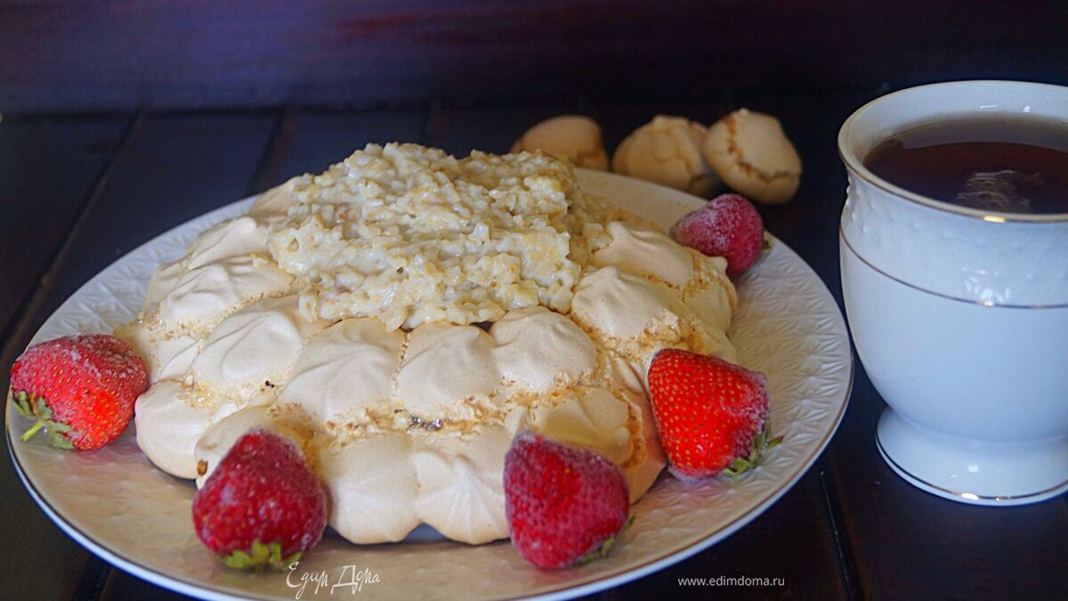 На тарелку устанавливаем конструкцию из безе, в углубление горкой выкладываем кашу и украшаем на свой вкус. У меня была замороженная клубника.