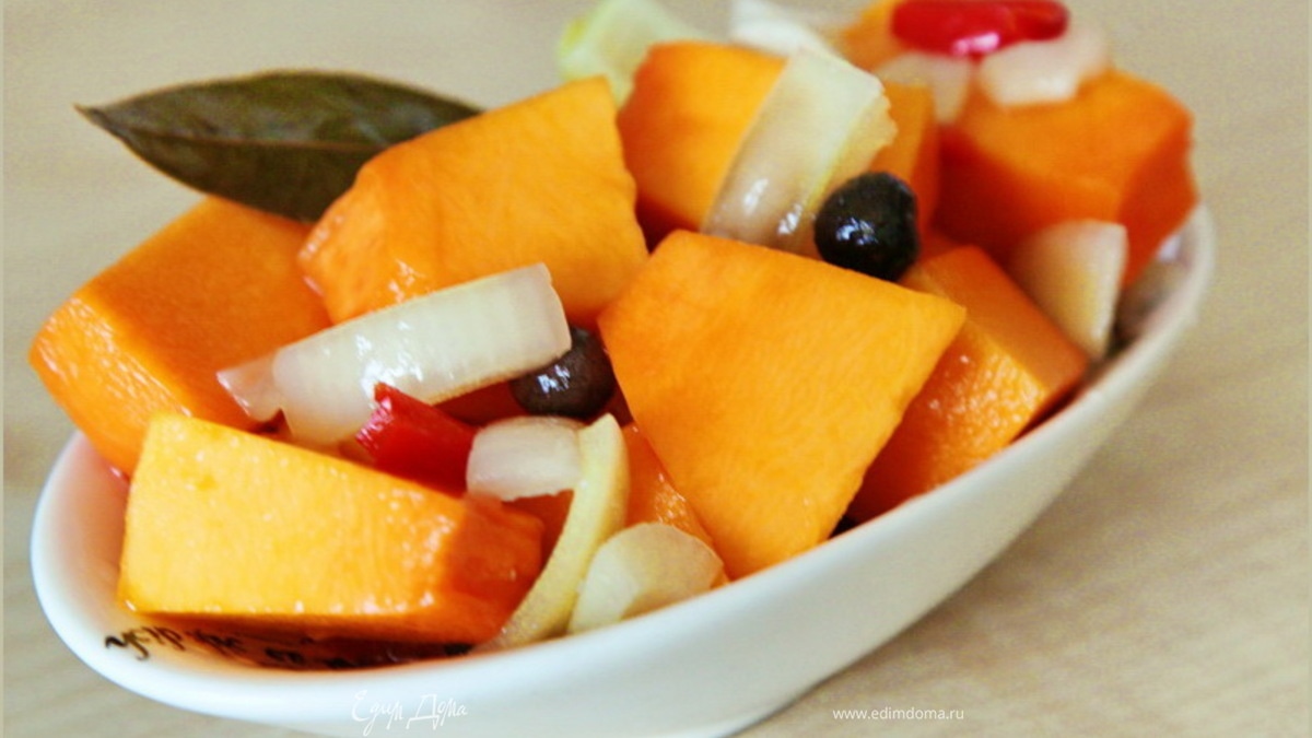Вряд ли я здесь удивлю кого-нибудь этим рецептом, да и цели такой нет. В одном кулинарном журнале нашла этот рецепт, на тот момент все было в наличии, и я приготовила. Результат потрясающий! Даже мой внук, который тыкву не ест совсем и даже слышать о ней ничего не хотел — съел и ему понравилось. Правда пришлось ему положить такие кусочки, чтобы было похоже на морковь, но главное, что он съел, а потом так хитро улыбаясь и, глядя мне в глаза, сказал: "А ты меня обманула: это не морковка, это тыква! Но вкусная! Я ее буду". В душе поют соловьи! Я сейчас буду готовить новую порцию, а этой поделюсь с вами, мои хорошие. Вдруг и вам пригодится. Время готовки указано без учета времени, которое уходит на маринование тыквы. Указан вес уже почищенной тыквы.