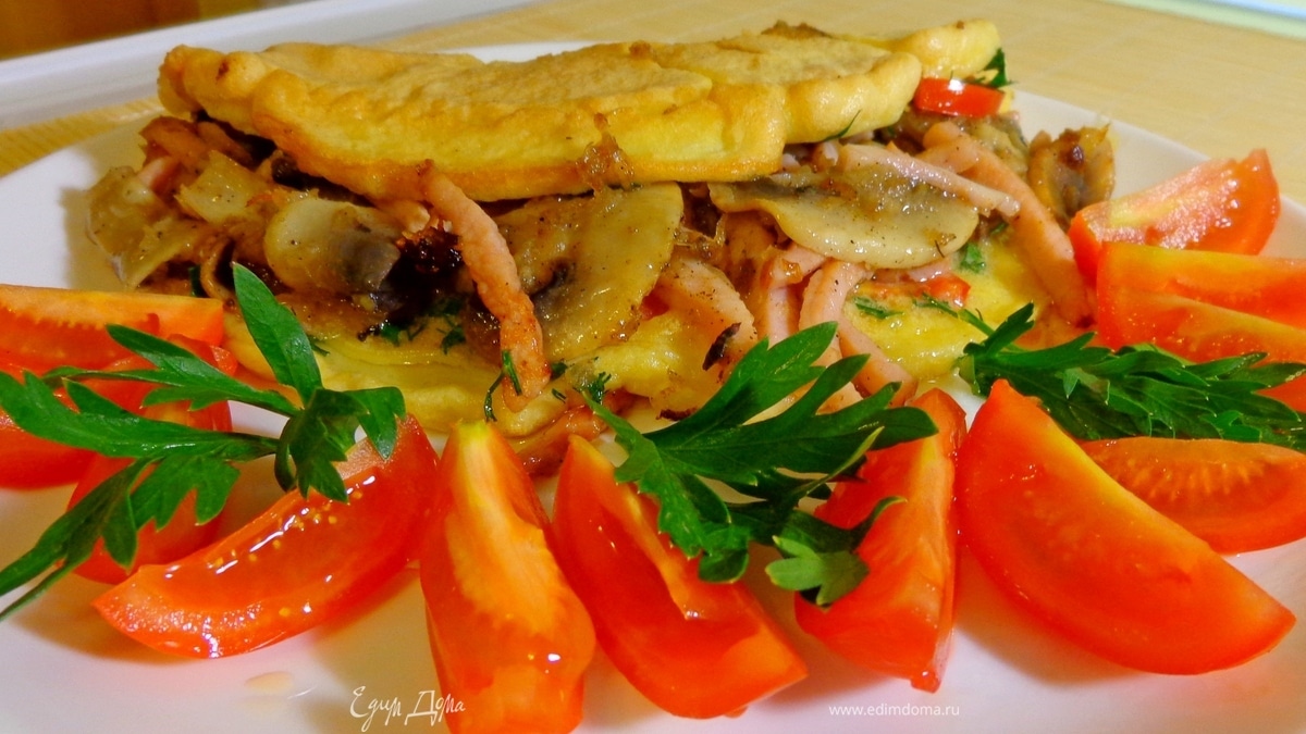На одну половину сковороды положить ветчинно-грибную начинку и жарить под крышкой до готовности. - Шаг 6