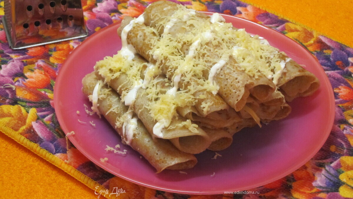 Выложить тертый сыр на каждый блинчик. Можно добавить мелко нарезанную ветчину. Свернуть в рулетики. - Шаг 10