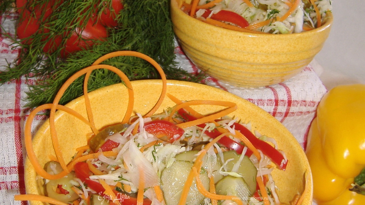 - Шаг 1Морковь, перец, лук и капусту нарезать соломкой (капусту можно нашинковать специальным ножом). Чеснок и укроп измельчить (я чеснок нарезаю для этого салата пластинками). Маринованные огурцы нарезать кружками. Капусту присыпать солью и слегка "пожамкать" руками.