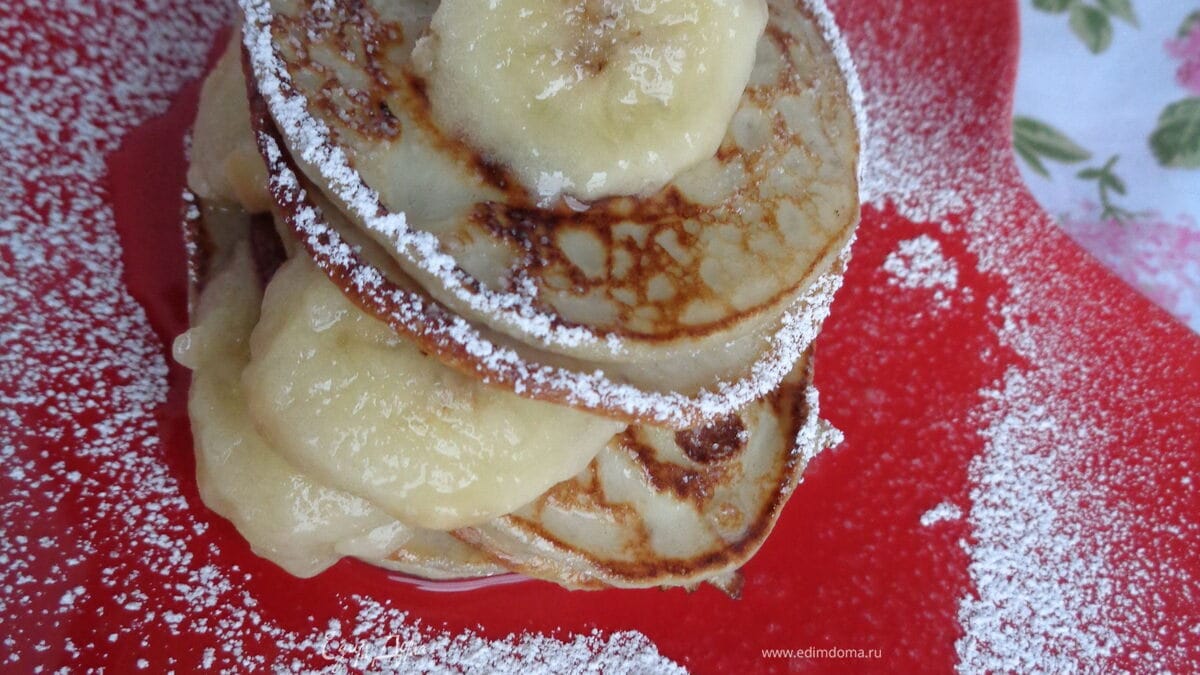 1 банан нарезать шайбочками и сбрызнуть лимонным соком. На тарелке собрать горку из оладьев, прокладывая их бананами. Щедро посыпать сахарной пудрой. Приятного аппетита!