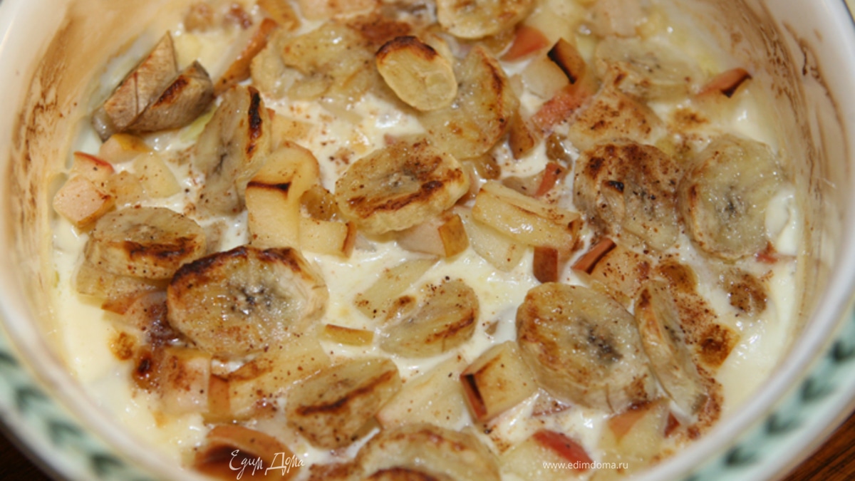 Большую форму для выпечки или несколько небольших форм смазать оставшимся сливочным маслом, разложить в них припущенные фрукты, а сверху банан. - Шаг 7