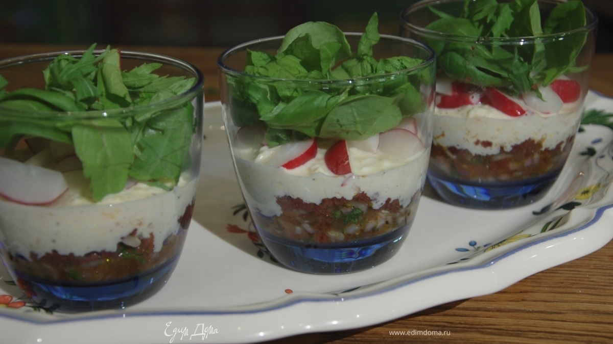 В прозрачные бокалы выложить слой помидоров с луком и тонкий слой тапенада, затем слой яичной смеси с майонезом и сметаной, кусочки редиски, а сверху листья салата.