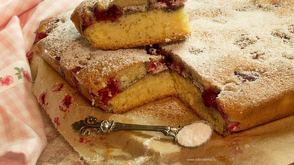 Готовый пирог слегка остужаем и посыпаем сахарной пудрой. При таком способе приготовления пирог получается воздушный, хорошо пропеченный, и ягоды не опускаются вниз пирога, давая ненужный сок в процессе выпечки.