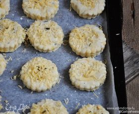 На рабочей поверхности раскатать тесто в пласт толщиной 1 см., вырезать кружки или треугольники, разложить на противне.