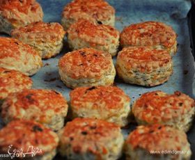 Смазать сконы болтушкой из смеси желтка и молока, посыпать сыром и отправить выпекаться 10-15 минут.
