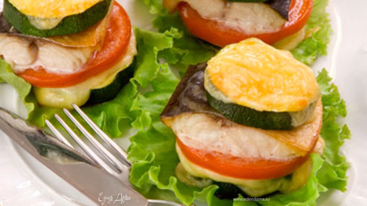 - Шаг 11. Скумбрию разделайте на филе с кожей, нарежьте его кусочками и посолите. 2. Цукини нарежьте ломтиками, помидоры — кружочками. Сыр натрите на терке. 3. Половину ломтиков цукини выложите на противень, смазанный маслом, посыпьте половиной тертого сыра. 4. Уложите кружочки помидоров, кусочки рыбы, накройте оставшимися ломтиками цукини, посыпьте оставшимся сыром и запекайте 20 минут при 200 °С. 5. Подавайте закуску, выложив на листья зеленого салата.