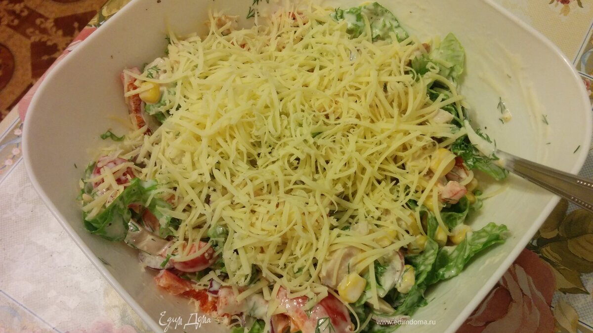 Куриную грудку нарезать на пластины, затем соломкой наискосок, с болгарским перцем (он должен быть не большой) поступить так же. Листья салата разрезать пополам, и нарезать широкими полосами, укроп мелко порубить. Лук сладкий (у нас в Крыму он называется — ялтинский) полукольцами нашинковать, с кукурузы слить сок, все ингредиенты соединить в миске. - Шаг 1