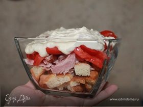 Первый рецепт на сайте... Оставалась от предыдущего салата половинка копченой куриной грудки, решила быстро смастерить салатик — сборный на ужин и вот что получилось... Можно и на каждый день, а можно и на праздничный стол, очень салатик яркий!