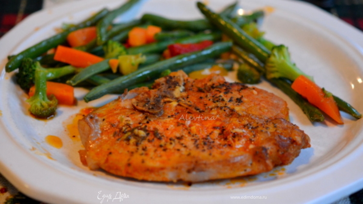 Смазать свиные котлеты тонкой нарезки в этой смеси с обеих сторон. Выложить на противень с бумагой или фольгой для выпечки. - Шаг 2