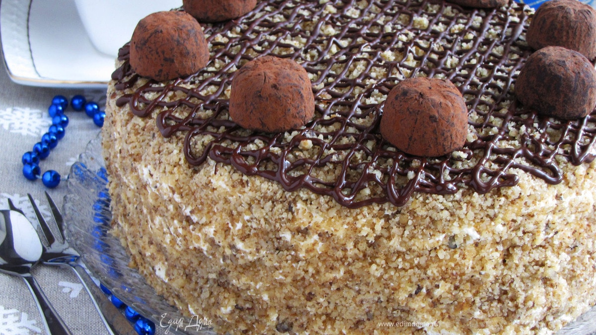 Нежный ореховый бисквит, пропитанный сиропом с добавлением апельсинового ликера. Творожный крем с легкой цитрусовой ноткой. Ореховая крошка, немного шоколада и трюфельные конфеты для украшения.