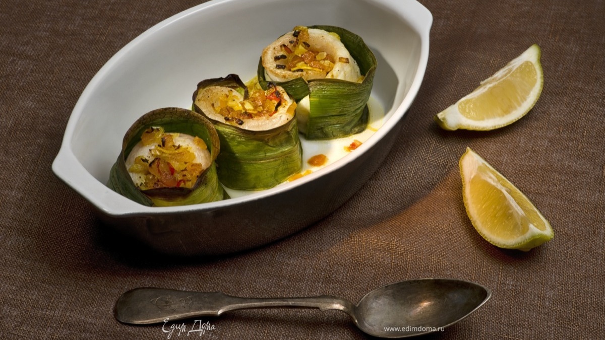 Листья лука порея выложить на разделочную доску, сверху на каждый лист поместить рыбное филе и аккуратно свернуть рулетики. - Шаг 6