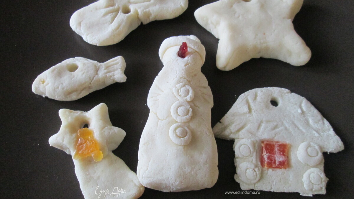 Таким же образом лепим другие игрушки — все зависит от вашей фантазии и фантазии ваших детей! Готовые игрушки подсушиваем в духовке. Плоские подсохнут за 30 минут. Дальше дети будут раскрашивать их сами. Тесто можно хранить в пакете несколько дней при комнатной температуре — оно не теряет своей пластичности.