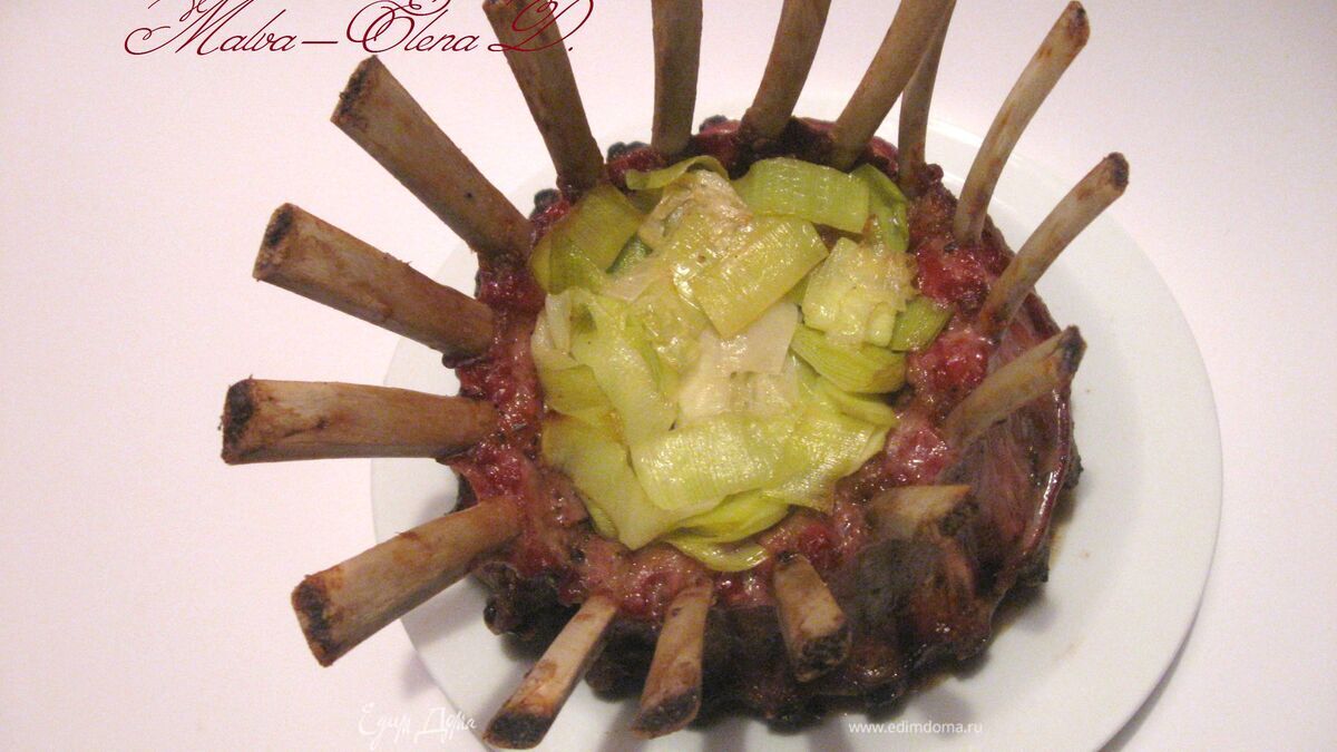 Гости будут приятно удивлены: не всем знакома такая подача блюда. Объединяющая, круглая форма его весьма подходит для подачи по особому случаю. Внутрь короны поместите любые овощи, которые лучше предварительно немного обработать, пока ягнятина запекается и покрывается румяной корочкой. Украсить блюдо можно запечеными овощами, помидорами черри, зеленью, выложенными по внешнему кругу короны.