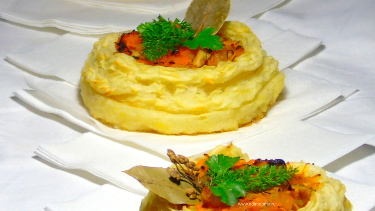 А можно из пюре сделать корзиночки и выложить закуску в них, а затем отправить под гриль на пару минут.