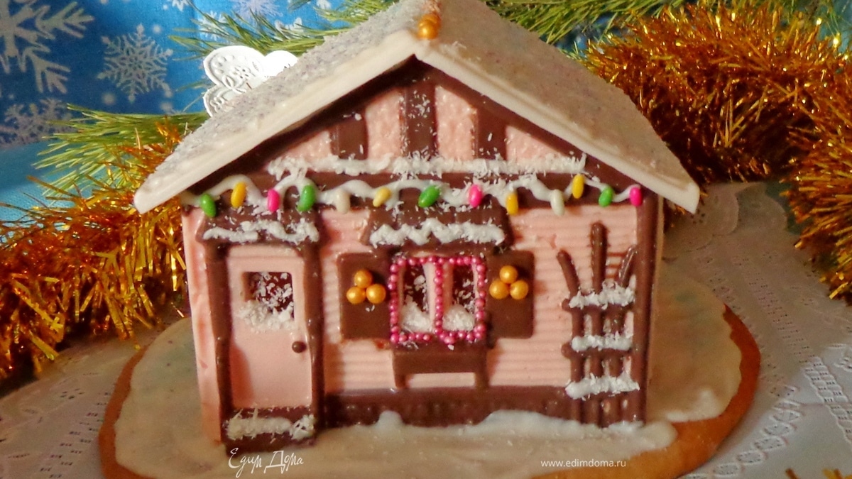 Для подставки раскатать пряничное тесто так, чтобы на него поместился наш домик. Аккуратно перенести домик и залить все белым шоколадом, особенно в местах фундамента. Украсить. Дарить. Радовать детей и взрослых.