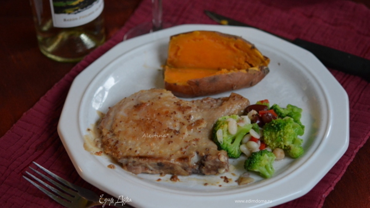 Добавить горчицу крупнозерновую, сливки и перемешать. Вернуть свиные отбивные. Раз перевернуть. Если жидкость у вас испарится добавить немного воды или бульона. - Шаг 3