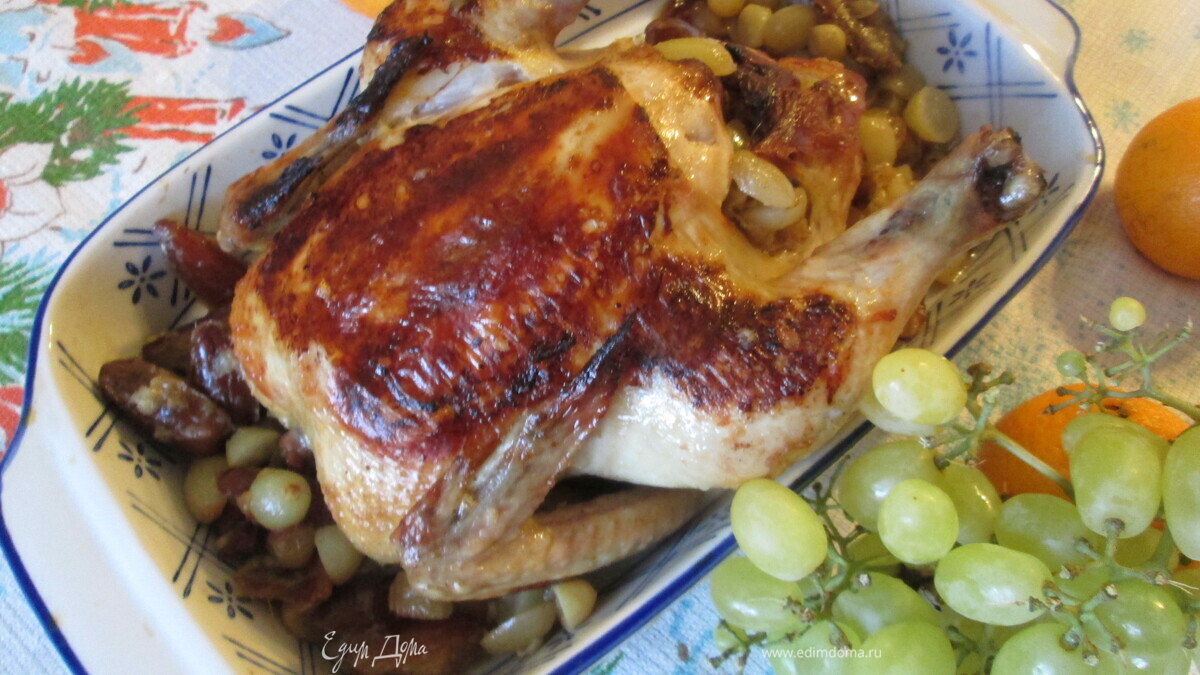 Хороша курочка! А какие ароматы! До меня долетел легкий аромат! Начинку с виноградом еще не встречала, наверняка очень вкусно.