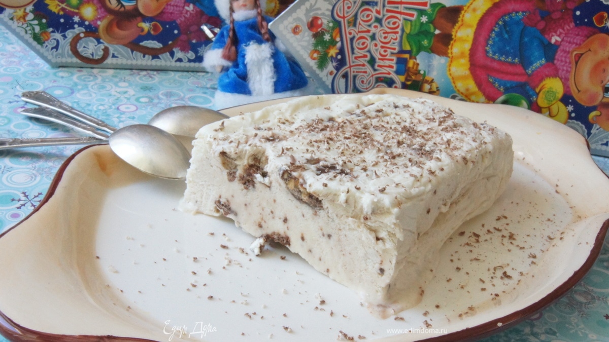 Поставить в морозилку на 5 часов. Убрать пленку и переложить на блюдо. Нарезать на кусочки. Сверху можно украсить тертым шоколадом. Если хотите мягкое мороженое, оставьте в морозилке на 3 часа и ложкой сформируйте шарики мороженого. Если оставляете на ночь, то за час до торжества переложите семифредо в холодильник. - Шаг 8