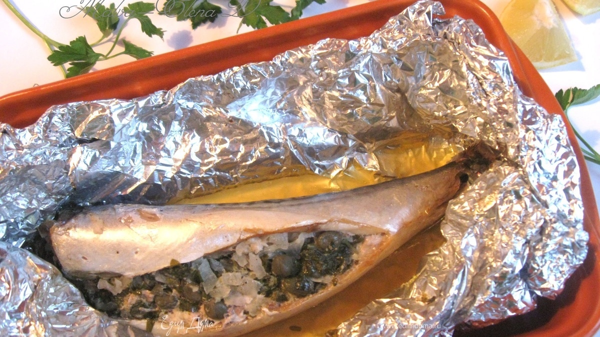 Подается прямо в фольге и сразу из духовки. С зеленью, кусочком цитрусовых. Полезная рыбка: большее количество жирных кислот Омега-3, хороший источник витаминов D и В12. Время приготовления даю, исключая