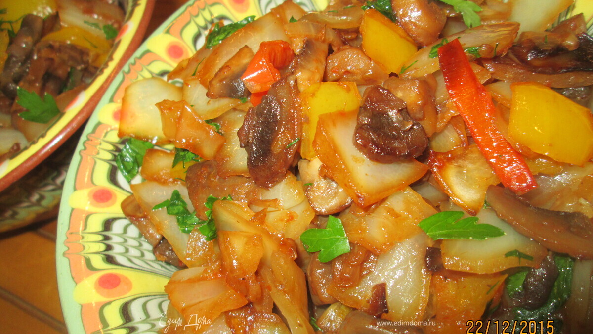 Имбирь и чеснок измельчаем. Зиру, кориандр, черный и душистый перец прогреваем на сухой сковороде и затем разотрем в ступке. Теперь обжарим на растительном масле капусту, затем в этой же сковороде жарим грибы, сладкий перец. - Шаг 2
