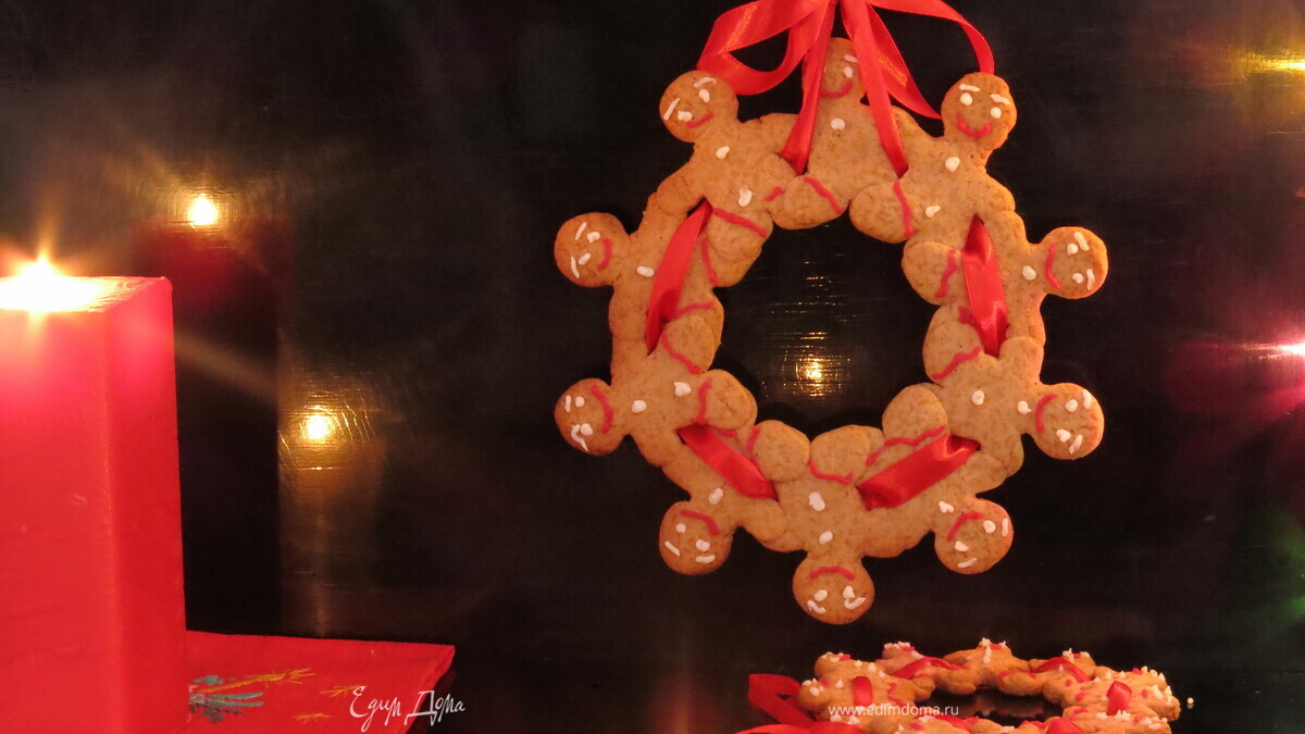 Выпекаем при 180°C 10-15 минут, даем пряникам остыть. Украшаем пряники с помощью карандаша: глаза, рот, брови, пуговицы и носочки. Даем глазури засохнуть. Продеваем ленту. Вот такой венок из маленьких человечков. Приятного аппетита!
