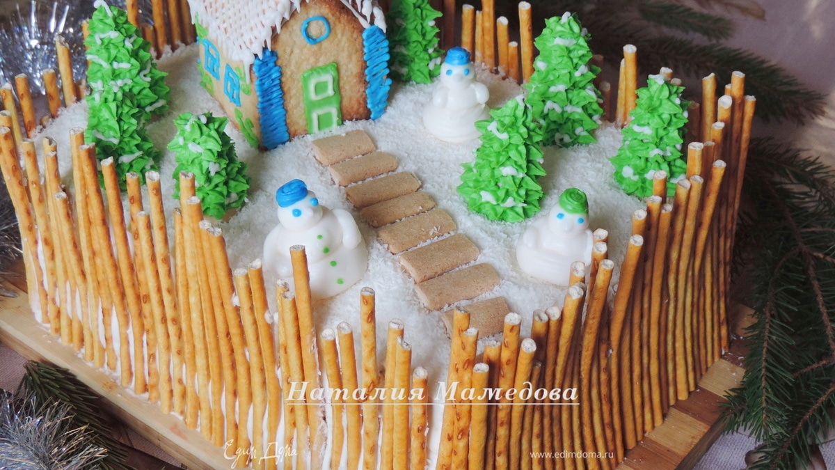 Торт сверху щедро посыпаем кокосовой стружкой, чтоб от сливочного крема айсинг не начал подтаивать. А затем выставляем наши украшения: домик, снеговиков, елки. Из кусочков печенья "бамбук" я дополнительно выложила дорожку. - Шаг 13