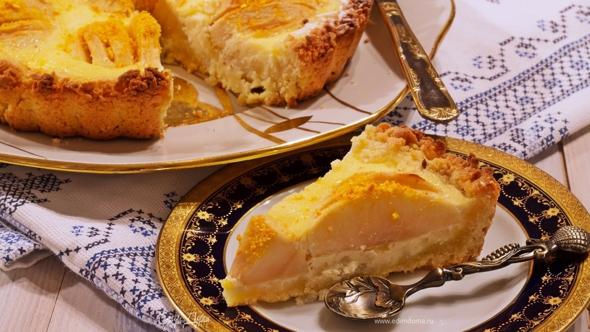 Этот удивительный пирог напомнит о лете и солнышке даже в самый пасмурный день. Крем с кислинкой прекрасно сочетается с рассыпчатым тестом и сочными яблочками.