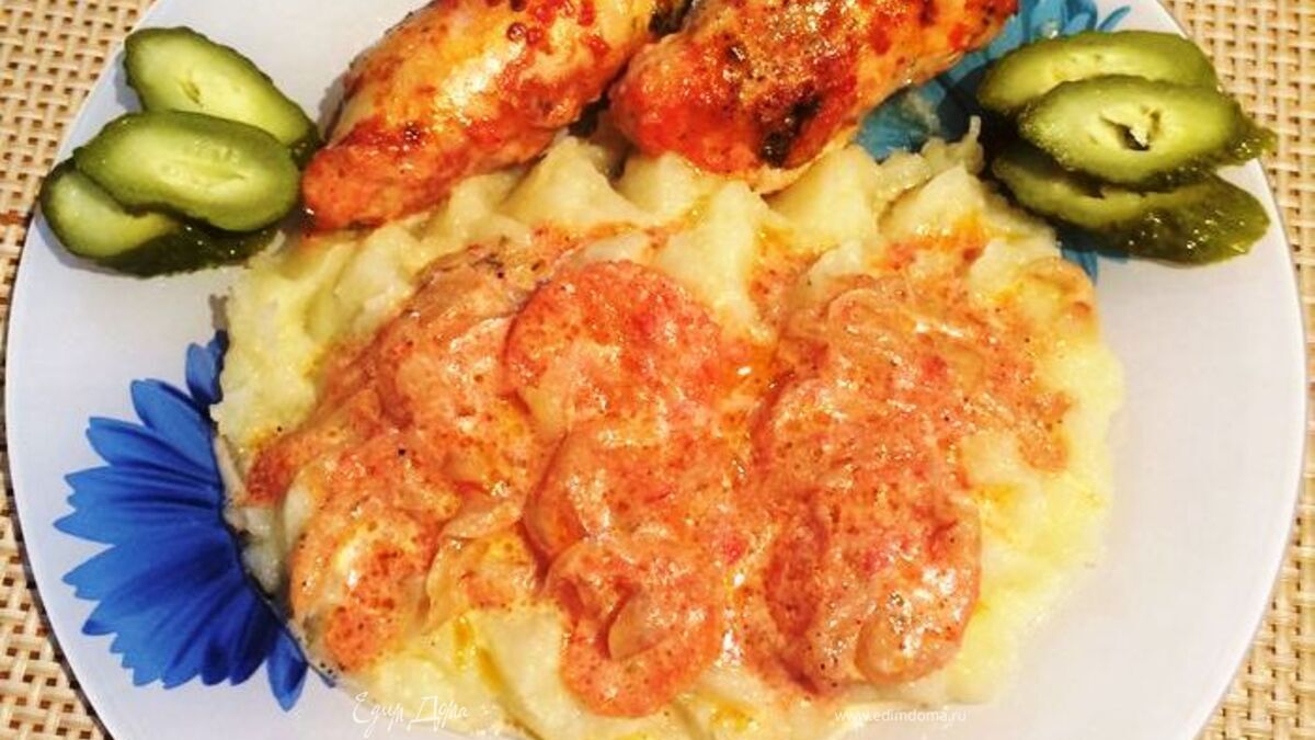 Вынимаем форму из духовки и подаем с любимым гарниром, салатом, чего только ваша душа пожелает. Я подавала с пюре и маринованными огурчиками. Было очень вкусно. Приятного аппетита!
