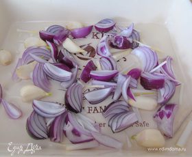 Лук (4 шт) и чеснок очистите. Лук нарежьте на четвертинки, чеснок целый уложите на дно смазанной формы для запекания.