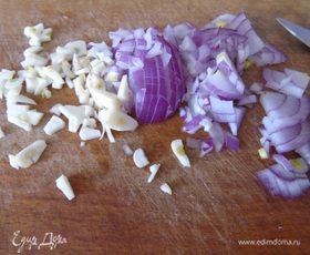 Еще дополнительно 2 зуб чеснока и оставшуюся луковицу мелко измельчите.