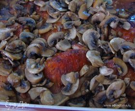 Посолите и поперчите мясо и выложите поверх. Отправьте в разогретую до 170°С духовку примерно на 30 минут, до золотистости.